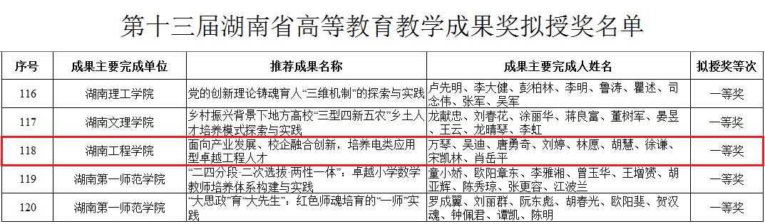 近日,湖南省教育厅发布了《关于第十三届湖南省高等教育教学成果奖拟授奖成果的公示》,麻豆性爱 院长万琴主持,吴迪、唐勇奇、刘婷、林愿、胡慧等多位老师参与完成的《面向产业发展、校企融合创新,培养电类应用型卓越工程人才》喜获一等奖,取得历史性突破。