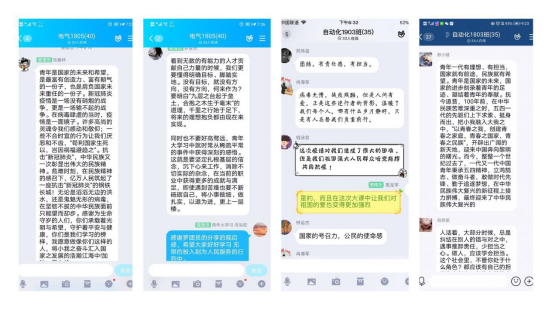 同学们相聚“云”端,通过线上会议、QQ群讨论等方式,深入学习贯彻习近平总书记给北京大学援鄂医疗队全体“90后”党员回信原文及精神,一同观看《中国战“疫”大思政》网络课程,并展开积极讨论,发表自身感想,探讨作为新时代新青年的责任与担当。“青年学生作为社会主义事业的建设者和接班人,应当树立强烈的历史使命感和责任感,把个人前途同国家命运紧密联系在一起,将国家利益摆在首位。”自动化1803班郭梦雨这样说道。电气工程1805班罗宣怡认为,青年团员要明确目标,脚踏实地,将小事做细、做扎实,将来才能担当“复兴大任”。“经历了这段特殊的‘抗疫’时期,我深切感受到了党和国家的伟大,明白了生命的价值和意义,我们要心怀感恩,珍爱生命。”自动化1903班肖海军说。
