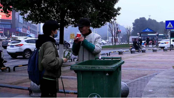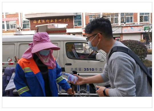 图为新能源1902班易卓凡同学给环卫阿姨送水
