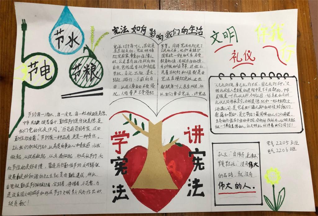 主题班会分为3个板块开展,用权威数据说明目前资源紧缺现状,引导同学们认识到节水、节粮、节电的重要性;利用PPT展示向同学们详细介绍了宪法的来源、地位、内容、意义,向同学们普及宪法知识;以图片的方式展示了生活中常见的不文明行为,以此警示大家,提醒同学们应注意相应的会议礼仪、用语礼仪、行为礼仪等,具有很强的教育意义。
