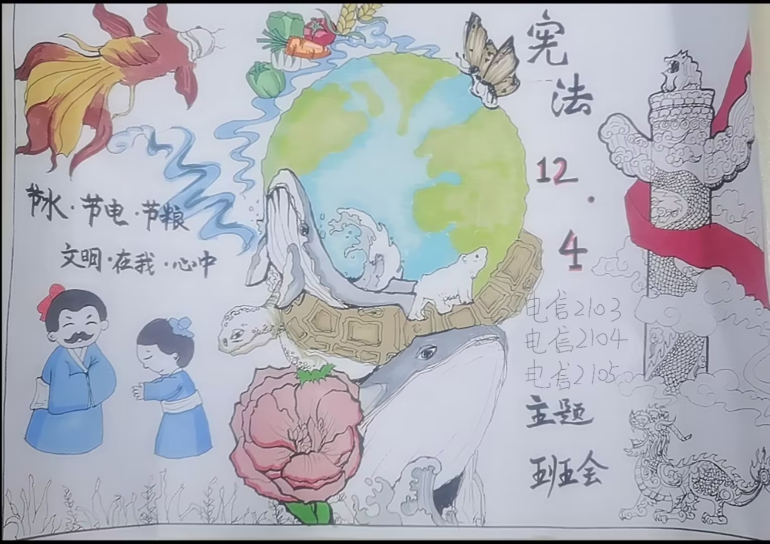 班会伊始,主讲人刘奕臻首先通过一段视频让同学们了解了当今资源紧缺的现状,引导同学们要养成节约的行为习惯,随后,组织同学们针对宪法作为国家根本法与普通法律有什么区别这个问题进行讨论,同时对同学们讨论过程中存在的疑问进行解答,引导同学们增强国家意识、法制意识和社会责任意识。最后设计文明礼仪“你画我猜”趣味小游戏,激发学生内心对文明礼仪的追求,争取做以德为先、以学为上的时代新人。