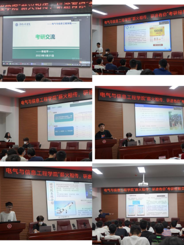 随后,五名同学分别把自己的考研过程与经历进行了分享。考入重庆邮电大学的电信1902班胡彬,初试成绩432分,他主要分享考研各科目如何进行有效学习取得高分,他认为要把握各个科目的特点,找到适合自己的学习节奏,再通过大量的练习提升自身的计算能力、阅读能力,理顺做题思路。考入湘潭大学的自动化1901班张子鑫围绕报考学校选择、国家线院校线划分、国网直属高校、专业代码、就业方向等方面告诉同学们如何择校,通过择校提高一志愿上岸率。机器人1903班游方被华南师范大学学科教学数学专业录取,他针对的是跨专业考生,告诉同学们首先要明确未来规划,从而再进行学校和专业的选择以及考研注意事项等经验分享。考入中国科学院物理研究所的电信1901班杜超则分享了中国科学院大学研究所系统的基本情况,分析了当前考研现状以及该学校内部专业调剂的一些注意事项。考入华东交通大学的自动化1901班徐涵通过表格列举相关学校往年录取初试和复试分数等数据,帮助大家找到适合自己的目标院校,同时鼓励同学们积极参加各类学科竞赛、创新创业大赛和“三下乡”社会实践等活动,通过获奖提高复试面试阶段核心竞争力。
