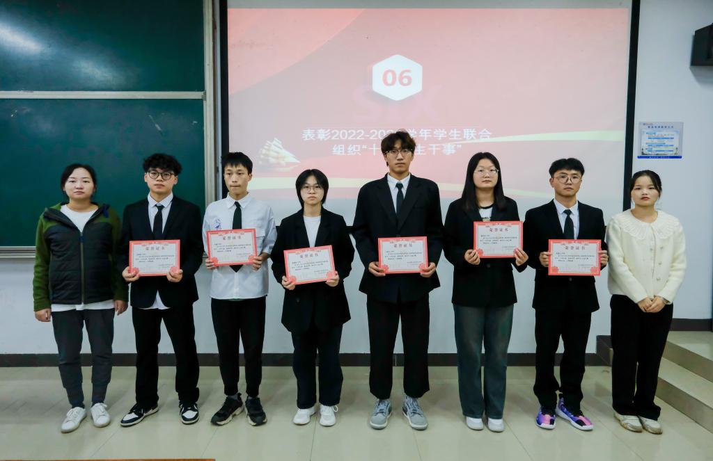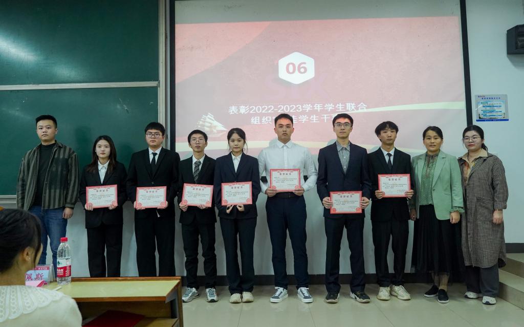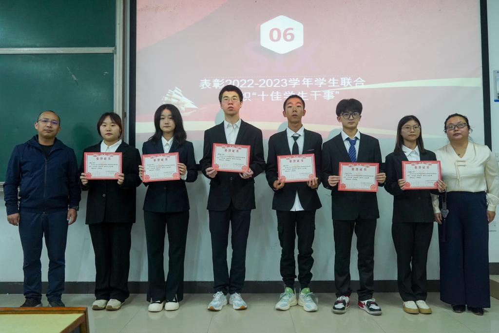 随后,学生工作办公室主任赵玲令宣读了关于2022-2023年度十佳学生干事的表彰决定,各位老师依次为获奖学生颁奖,并合影留念。