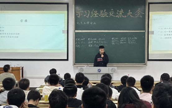 电气工程及其自动化专业经验分享会在D101召开。主持人颜子熙介绍分享嘉宾为电气2202刘辉祥和电气2204燕为清两位同学以及他们的获奖情况、优异表现。