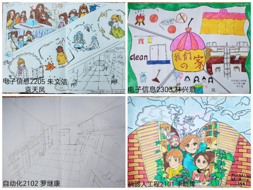 “‘寝’你一起,‘寓’见美好”活动不止有体力劳动的评比,也有头脑艺术的评比。在线下绘画展之“文明宿舍”绘画大赛活动中,同学栩栩如生地描绘了日常的学习和生活状态。机器人2101班李晓烽同学的画作中体现了人与人之间相互尊重却不失活泼可爱、青春飞扬的寝室风气。这不仅营造了各个寝室和谐向上的风气,也拉近了同学之间的距离。