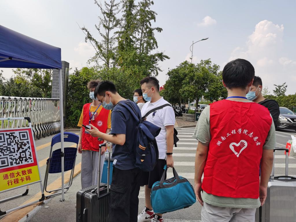 “同学,请出示一下你的返校通知单,并在这里扫码”,“同学,行李这么多,我来帮你送进寝室吧”,经过培训的志愿者们立即投入到紧张有序的工作中,贴心周到地为返校生提供力所能及的帮助和服务,积极引导返校生有序排队、耐心提示学生扫健康码和行程码、核对返校通知单、做好学生临时出校登记、帮助搬运行李等等。
