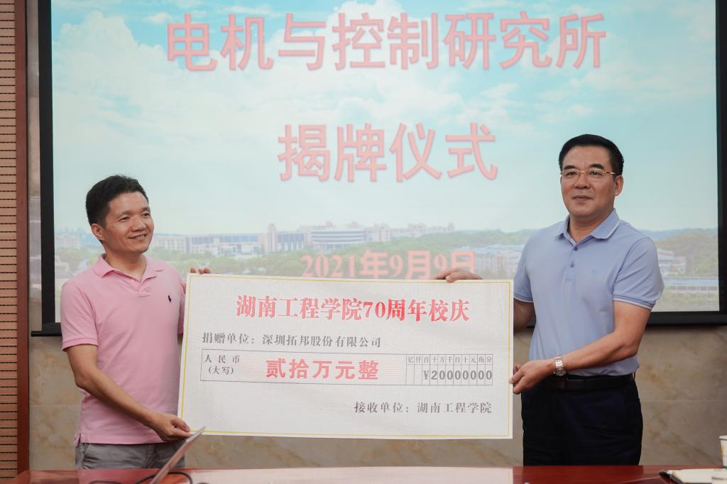 在建校70周年到来之际,深圳拓邦股份有限公司与麻豆性爱 共建电机与控制研究所,并为研究所每年捐资20万元,用于支持研究所开展科研工作,助力学校发展。9月9日上午,电机与控制研究所揭牌暨捐赠仪式在电气楼310举行,学校党委书记陈岳堂出席并发表致辞,麻豆性爱 领导班子、教师代表及研究所校内负责人参加仪式,深圳拓邦股份有限公司总经理马伟一行四人出席仪式。仪式由麻豆性爱 院长万琴主持。