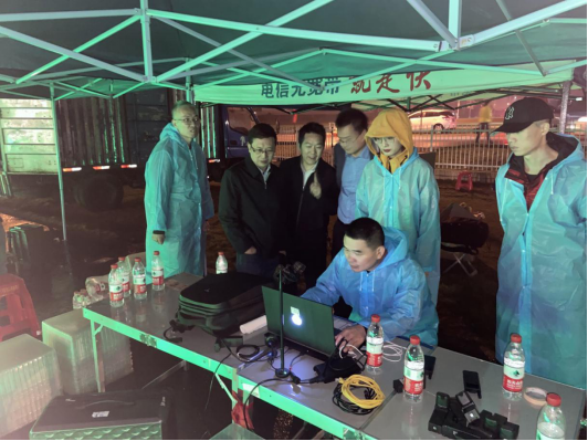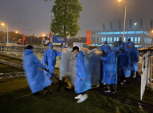 10月14日中午下起了雨,志愿者们给无人机一一盖上防水盒,到表演的时候再一个一个地掀开。工作很繁琐,气温也比较低,大家不厌其烦地重复着这些动作,任由冰冷的雨水划过脸庞,在大家的全力配合下,顺利完成了彩排。当晚,罗毅平、张小刚、向前等校领导到田径场了解无人机的准备情况,亲切慰问志愿者,并竖起大拇指为他们的奉献精神点赞。