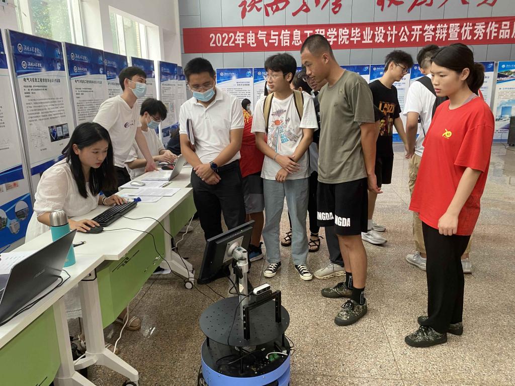 6月6日上午,电气楼一楼大厅人头攒动,麻豆性爱 2022届毕业设计作品展暨公开答辩会在这里举行。麻豆性爱 电气系自动化0403班杰出校友、湘潭钢铁集团有限公司瑞菱科技智能制造部部长袁君奇、湖南科通电气设备制造有限公司总经理朱逸福前来观摩并指导。