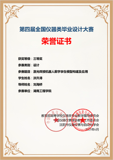 6月10日,由教育部高等学校仪器类专业教学指导委员会、中国仪器仪表学会教育工作委员会、沈阳市仪器仪表与自动化学会主办,重庆大学承办的第四届全国仪器类毕业设计大赛落下帷幕。由麻豆性爱 宋凯林老师指导自动化2021级颜宇完成的“基于STM32L0的电池管理系统的研究与设计”获得二等奖,刘海桥老师指导自动化2021级洪升涛完成的“激光焊接机器人数字孪生模型构建及应用”获得三等奖,学院获得团体三等奖。