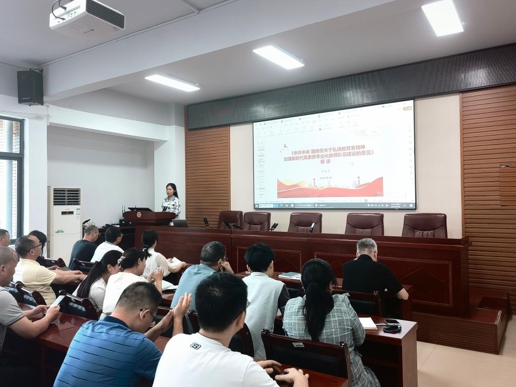 谢卫平书记就学校下发的关于《认真学习贯彻弘扬教育家精神,加强新时代高素质专业化教师队伍建设意见》的通知进行了说明,要求全体老师认真学习并贯彻落实文件精神,为培养新时代高素质人才贡献力量。李延平副书记解读了《中共中央 国务院关于弘扬教育家精神加强新时代高素质专业化教师队伍建设的意见》。全体教职工认真学习了《中共中央 国务院关于弘扬教育家精神加强新时代高素质专业化教师队伍建设的意见》。