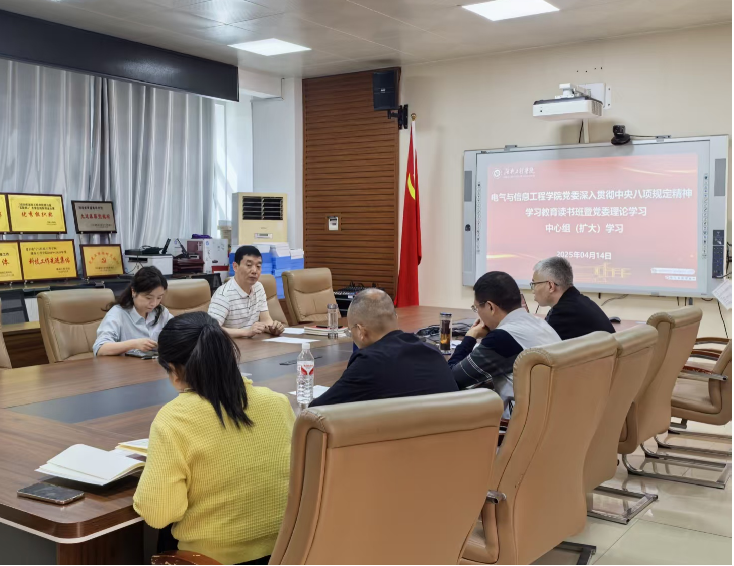 4月14日,学院党委召开深入贯彻中央八项规定精神学习教育读书班暨理论学习中心组(扩大)学习会,深入学习贯彻习近平总书记关于加强党的作风建设的重要论述和中央八项规定及其实施细则精神。学院党委书记张玉东主持并讲话,院长、党委副书记万琴和中心组成员出席并领读领学相关篇目,学生党支部书记列席参加。