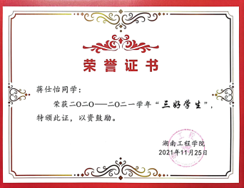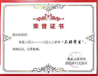 升升如阳,煦煦山立。我积极参加志愿服务、文体比赛等课外活动,作为蓝信封通信大使通过书信来陪伴留守儿童的成长、定期前往湘潭大桥社区看望老人、参加全国大学生环保知识竞赛并荣获优秀奖。